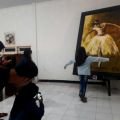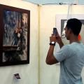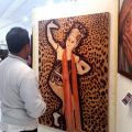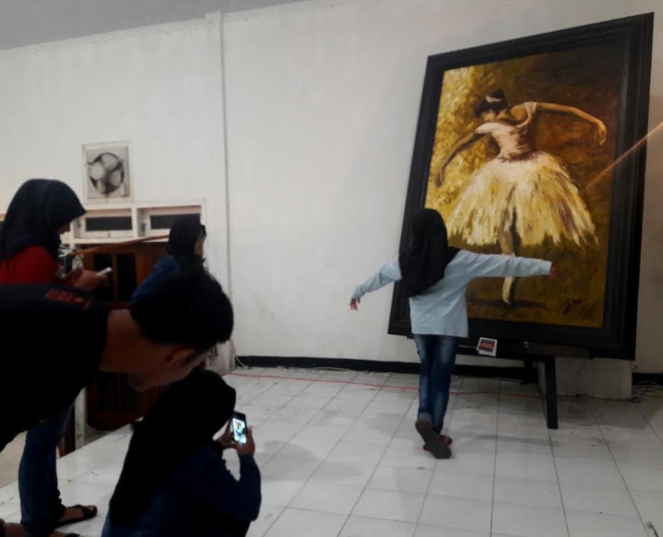 Seorang anak terlihat mengikuti tarian balet dalam lukisan pada pameran Painting and Photography di Gedung Wanita Paramita Kencana