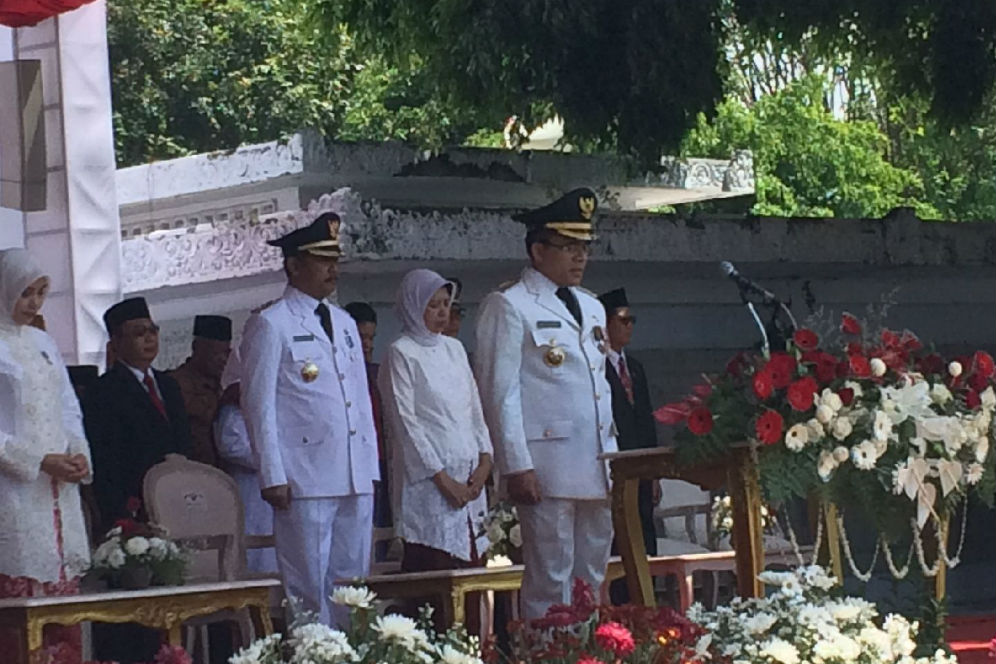 Bupati Abdullah Azwar Anas memimpin Upacara Detik-detik Proklamasi Kemerdekaan RI di Taman Blambangan, Banyuwangi, Jawa Timur, Rabu (17/8). Teks proklamasi dibacakan Ketua DPRD Banyuwangi, I Made Cahyana Negara, usai terdengar sirine selama sekitar satu menit.