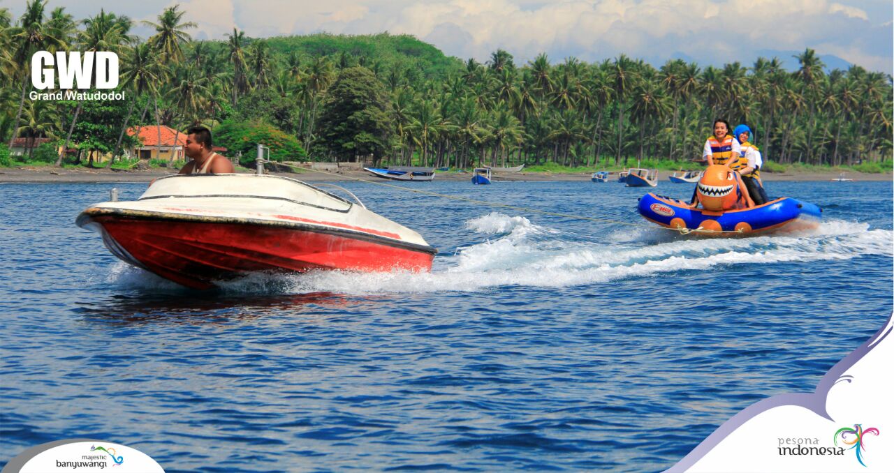 Warna pantai yang biru dan wisatawan bisa bermain sepuasnya dengan naik speed boat. Mau?