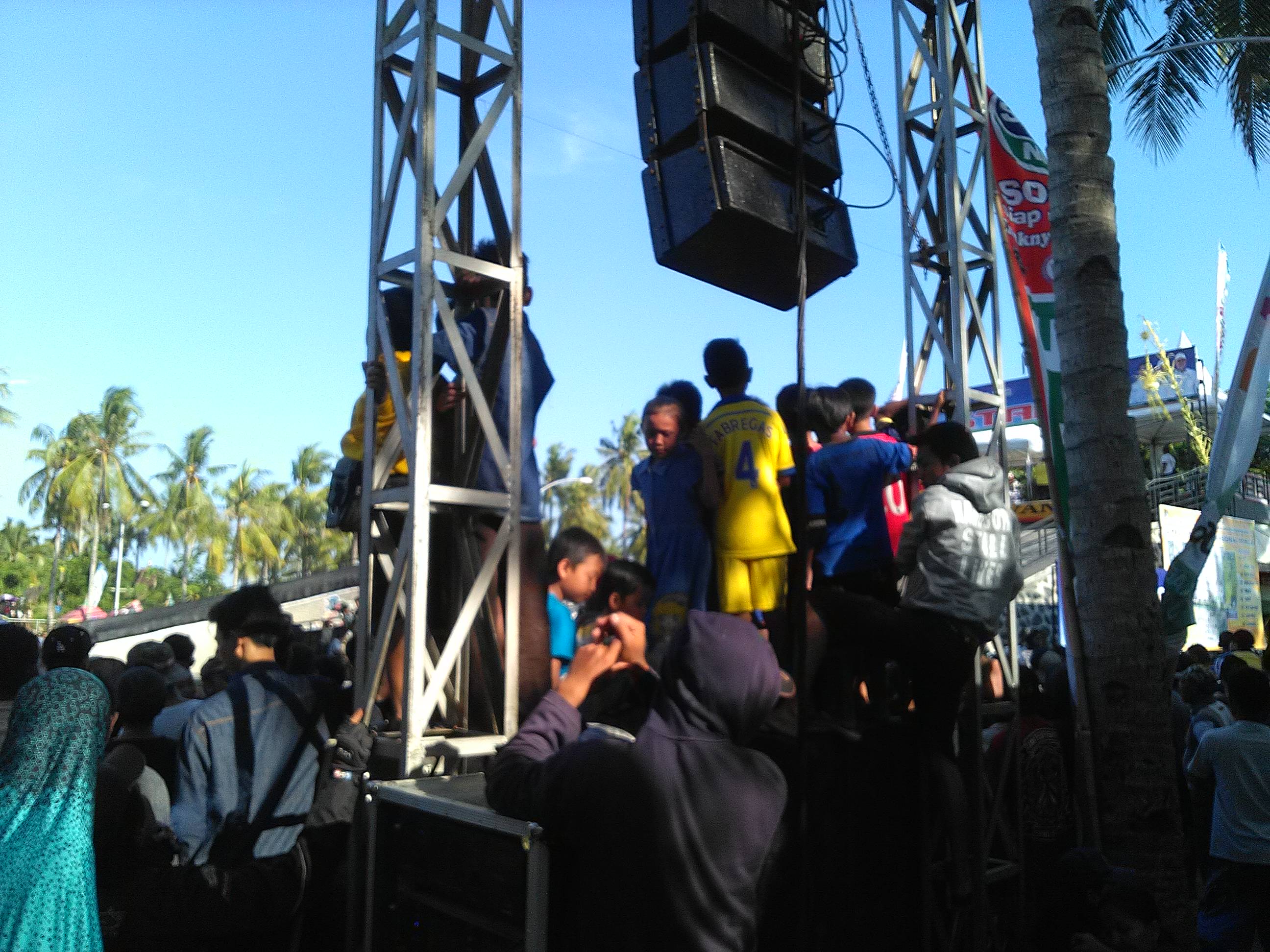 Warga ada yang naik-naik ke atas panggung demi melihat penampilan para atlet.