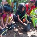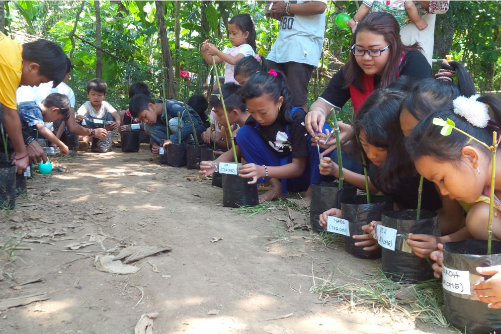 Anak-anak Kampoeng Batara saat melekatkan nama di polibek bibit bambunya masing-masing