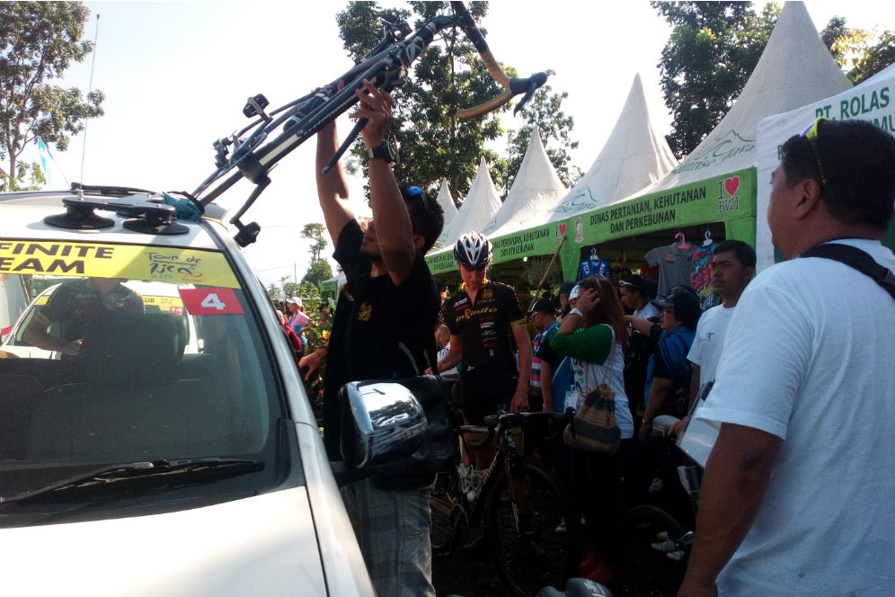 Official tim dari peserta ITdBI 2016 tampak mempersiapkan sepeda menjelang perlombaan etape pertama