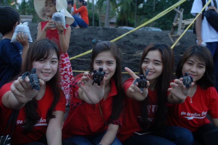 Indah (27) yang mengantarkan anaknya melepaskan tukik mengaku senang bisa menemani anaknya turut serta menyelamatkan keberlangsungan ekosistem yang menjadi habitat penyu.