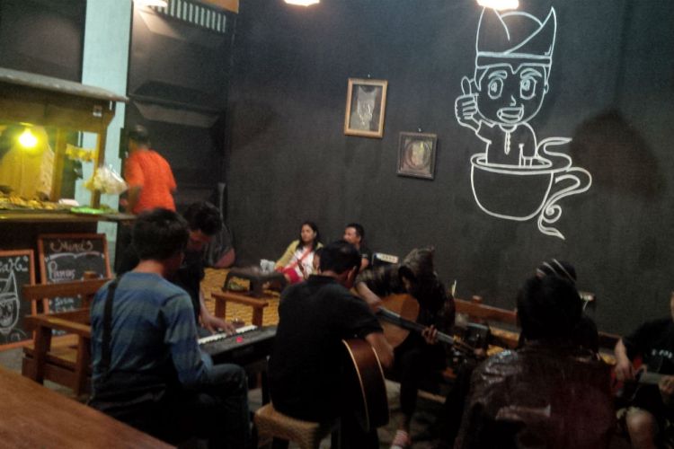 "Ada kelompok yang kebetulan ngamen, keliling kampung. Sering main musik di pertigaan dekat sini. Kemudian saya hadirkan di sini, untuk menyegarkan suasana. Dan mereka saya kasih reward, agar waktunya tidak sia-sia," ujar Sidik Bintoro Jalu (46), pemilik Angkringan Ngudi Raos pekan lalu.