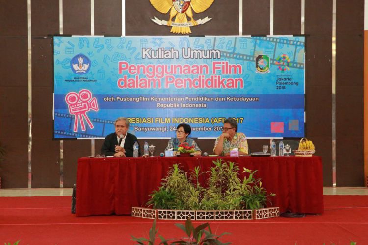 Merdeka.com, Banyuwangi - Rangkaian kegiatan Apresiasi Film Indonesia (AFI) di Banyuwangi terus berlanjut. Hari ini, Jumat (24/11) AFI menggelar Kuliah Umum Penggunaan Film Dalam Pendidikan di Aula Universitas Tujuh Belas Agustus Banyuwangi. Kuliah umum tersebut menghadirkan aktor kenamaan Indonesia Slamet Raharjo, Niniek L Karim, dan Bagus Takwin.