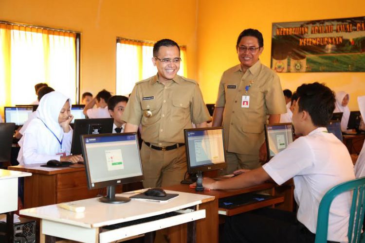 Bupati Anas memantau pelaksanaan UNBK di SMP 1 Banyuwangi. ©2017 Merdeka.com