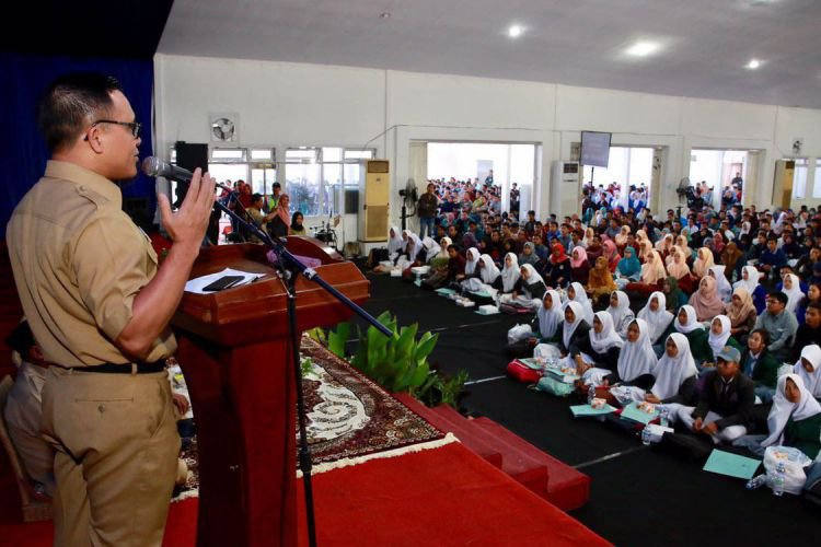 Bupati Anas memberi materi kewirausahaan dan strategi pemasaran online di hadapan pelajar Banyuwangi. ©2017 Merdeka.com