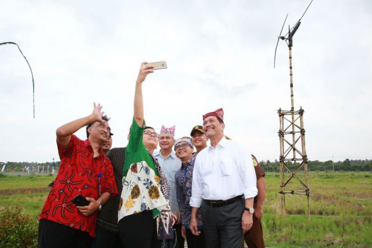 Terakhir sebelum beranjak dari bandara, Menkeu Sri Mulyani mengajak rombongan berselfie di depan hamparan sawah yang juga menjadi daya tarik pemandangan bandara.