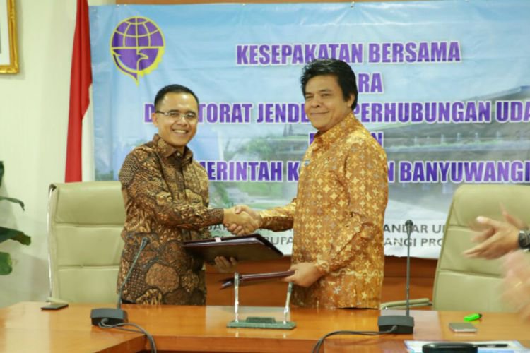 Merdeka.com, Banyuwangi - Kementerian Perhubungan dan Pemkab Banyuwangi bersepakat mengakselerasi pengembangan Bandara Blimbingsari, Banyuwangi. Dirjen Perhubungan Udara Kementerian Perhubungan Agus Santoso dan Bupati Banyuwangi Abdullah Azwar Anas menandatangani kerja sama terkait hal tersebut di Kementerian Perhubungan, Jumat (18/7).