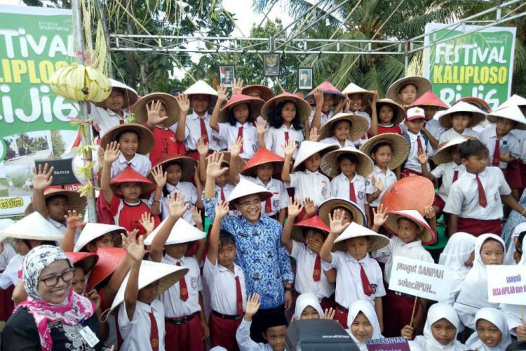 Saat Anas datang, puluhan anak-anak sekolah menyambut gembira dengan membawa papan bertuliskan 'cintai sungai, jangan buang sampah ke sungai, pungut sampah sekecilpun' dan slogan tentang menjaga kebersihan sungai.