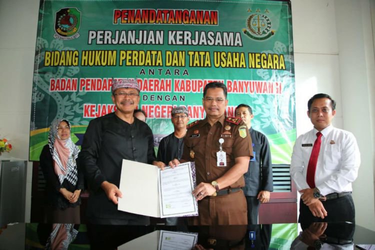 Perjanjian kerja sama bidang hukum perdata dan tata usaha negara itu ditandatangani Kepala Badan Pendapatan Daerah (Bapenda) Banyuwangi Agus Siswanto dan Kepala Kejari (Kajari) Adonis di Kantor Kejaksaan Negeri Banyuwangi, Selasa (11/12). Penandatanganan tersebut turut disaksikan Kepala Dinas Kebudayaan dan Pariwisata Banyuwangi MY. Bramuda.