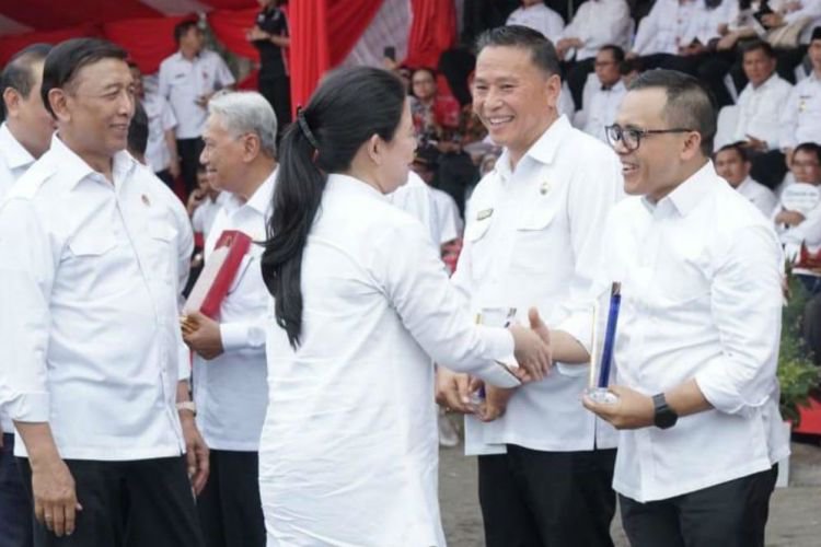 Merdeka.com, Banyuwangi - Menko Pembangunan Manusia dan Kebudayaan Puan Maharani menyerahkan penghargaan terkait Mal Pelayanan Publik (Mal PP) kepada Bupati Banyuwangi Abdullah Azwar Anas di Manado, Jumat (26/10). Penghargaan dari Kementerian Pendayagunaan Aparatur Negara dan Reformasi Birokrasi (Kemenpan-RB) itu diberikan kepada Banyuwangi sebagai kabupaten pertama di Indonesia yang menginisiasi berdirinya mal pelayanan publik. Acara tersebut juga dihadiri Menkopolhukam Wiranto dan Menteri PAN-RB Syafruddin.