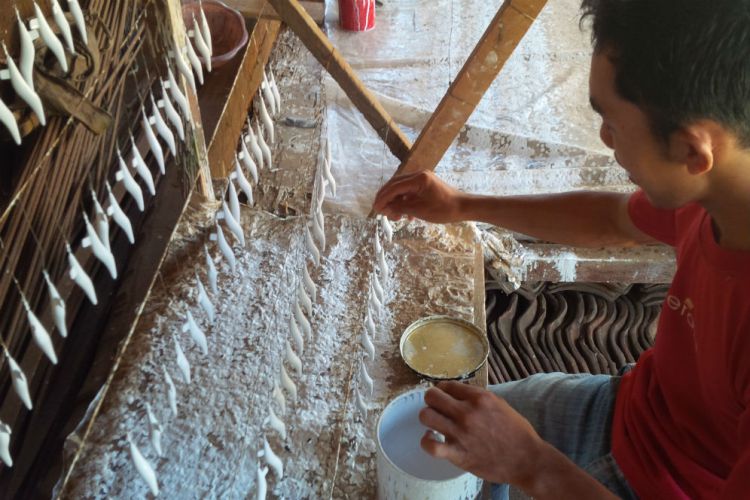 "Kalau sudah kering, setiap dua puluh menit dicelupkan lagi sampai tujuh kali. Tujuannya biar tebal cat dasarnya, baru dicat warna-warni," kata Ikhsan.