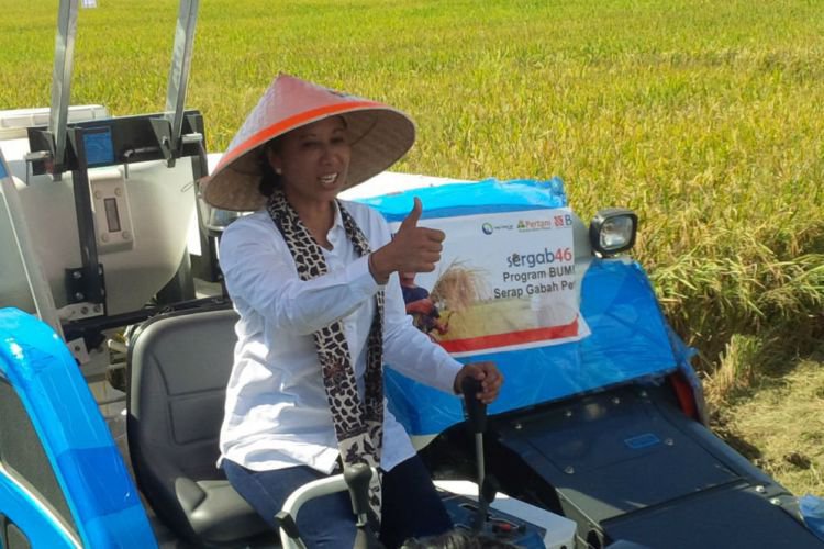 Merdeka.com, Banyuwangi - Menteri Badan Usaha Milik Negara (BUMN) Rini Soemarno berkunjung ke Banyuwangi untuk mengikuti kegiatan serap gabah yang digelar PT Pertani. Bahkan Rini mengoperasikan mesin panen padi modern dan cek kadar air padi di persawahan Desa Pondok Nongko, Kecamatan Kabat, Kabupaten Banyuwangi, Jawa Timur, Jumat (6/4).