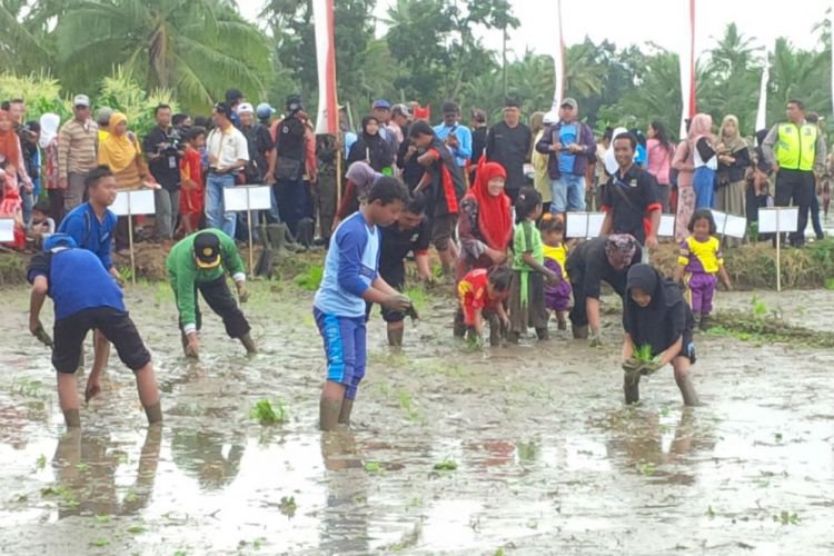 Yusuf kemudian melanjutkan praktik bercocok tanam padi bersama lintas generasi, petani dan anak-anak.