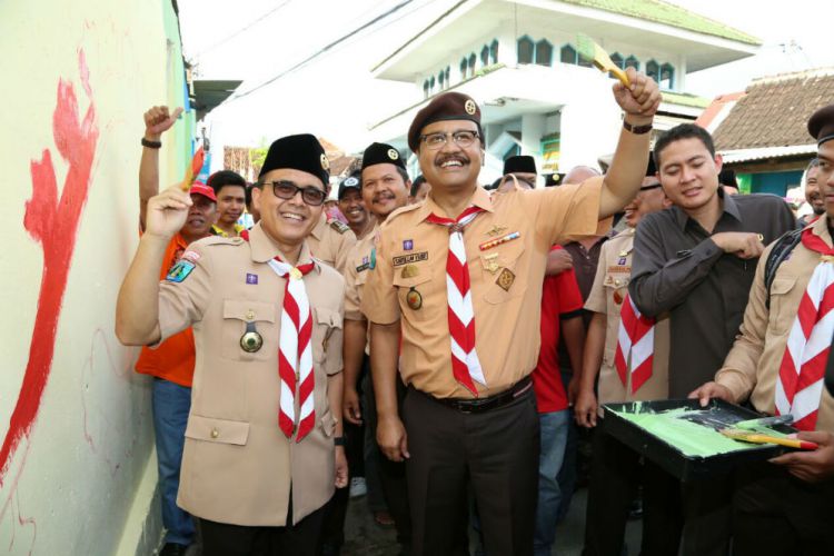 Merdeka.com, Banyuwangi - Wakil Gubernur Jatim Saifullah Yusuf berkunjung ke Banyuwangi membuka Festival Wirakarya Kampung Kelir, Senin (3/4). Dalam festival itu, sebanyak 1.000 kader Pramuka dari Banyuwangi, Situbondo, dan Bondowoso akan mempercantik dan mewarnai salah satu kampung di Banyuwangi, yaitu di Kampung Temenggungan.