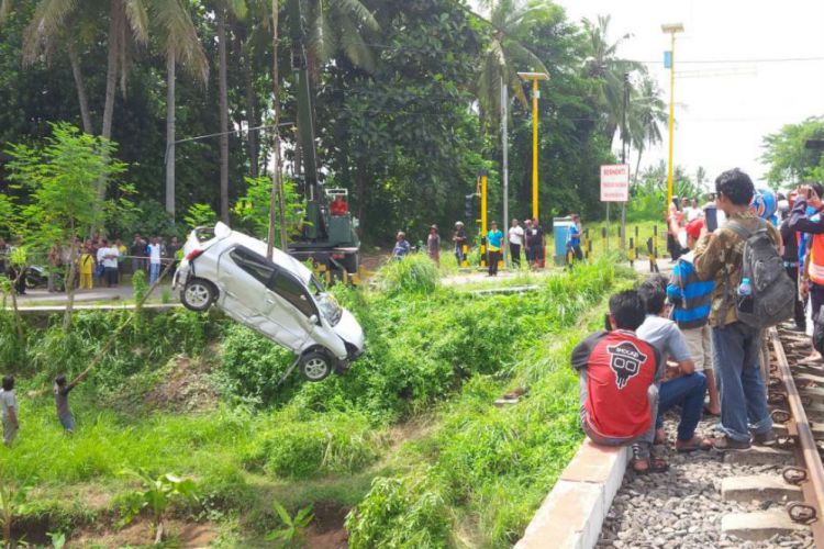 Jalur lintas kereta tidak berpalang ini berada di sebelah jembatan sungai. Mobil korban yang terseret, kemudian terpelanting dan masuk ke sungai.