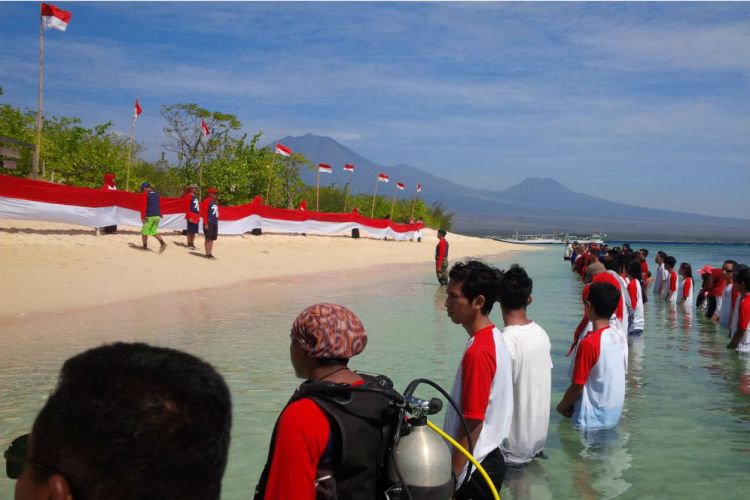 Merdeka.com, Banyuwangi - Memperingati hari kemerdekaan Republik Indonesia yang ke 72, Kelompok Nelayan Samudera Bakti Bangsring Underwater, Kecamatan Wongsorejo, Kabupaten Banyuwangi mengadakan upacara pengibaran bendera merah putih di Pulau Tabuhan. Sebuah pulau yang tidak berpenghuni.