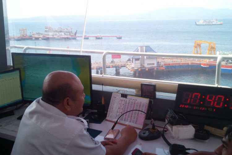 M. Saufi hadad Nizwan (49), Petugas Informasi Ship Traffic Controle (STC) Pelabuhan Ketapang selalu siaga memantau monitor arus lalu lintas kapal ferry yang menyeberang dari Banyuwangi ke Bali dan sebaliknya.