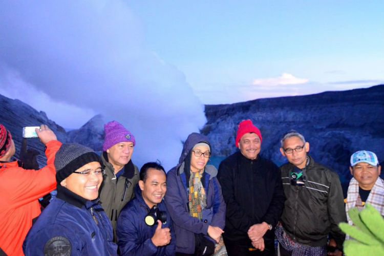 Merdeka.com, Banyuwangi - Menko Kemaritiman Luhut Binsar Pandjaitan, Menkeu Sri Mulyani Indrawati (SMI), dan Gubenur BI Agus Martowardjojo baru saja mendaki Gunung Ijen yang mempunyai fenomena blue fire (api biru). Di puncak gunung, mereka membikin testimoni berbentuk video.