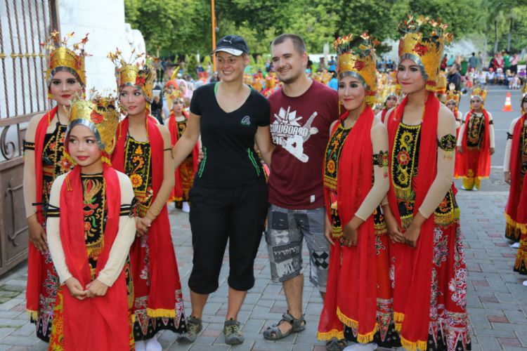 Adalah pasangan asal Italia, Beppe Castelli dan istrinya Fla yang tampak asyik mengabadikan setiap momen yang mereka lihat usai dikirabnya Piala Adipura berkeliling kota Banyuwangi, Senin (25/7).