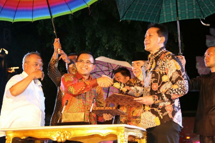 Merdeka.com, Banyuwangi - Untuk mengembangkan industri kreatif berbasis desa, Pemerintah Kabupaten Banyuwangi melakukan kerja sama dengan Badan Ekonomi Kreatif (Bekraf) Republik Indonesia. Pemkab dan Bekraf meneken Memorandum of Understanding (MoU) di sela pagelaran Banyuwangi Batik Festival, Minggu malam (9/10).