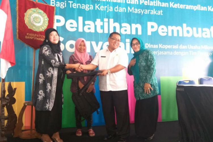 Merdeka.com, Banyuwangi - Pemerintah Kabupaten Banyuwangi, Jawa Timur menggelar pelatihan bikin souvenir kepada 30 orang ibu di Taman Blambangan Banyuwangi, Rabu (11/4).