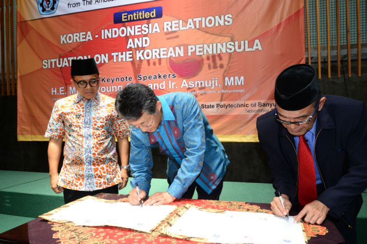 Kerjasama tersebut tertuang dalam nota kesepahaman yang ditandatangani di Kampus Poliwangi, Jumat (18/11). Penandatangan MoU ini dilakukan oleh Dubes Korsel dengan Rektor Politeknik Negeri Banyuwangi Asmudji.