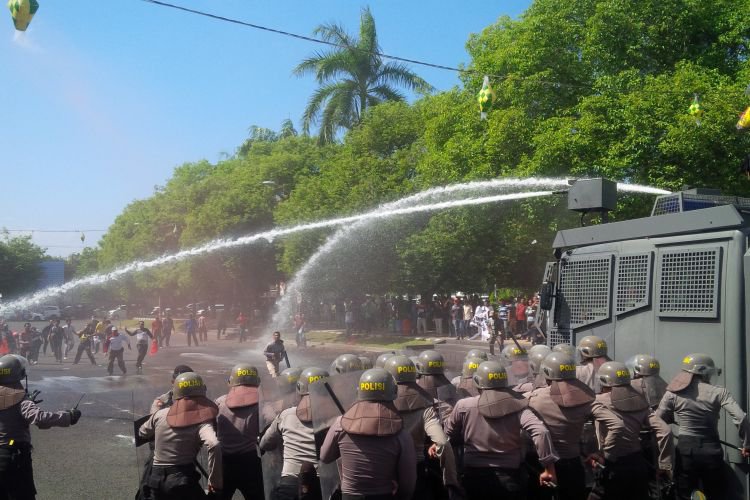 Kepolisian menanganinya dalam beberapa lapis peredaman, dari pagar barisan polwan dan anggota pengendalian masyarakat (Dalmas), pelepasan anjing pelacak yang telah terlatih menyerang perusuh, hingga penggunaan mobil water canon untuk menghalau masa yang anarkis tersebut. Proses demokrasi yang dalam simulasi diceritakan berada di Desa Minak Jinggo, Kecamatan Sritanjung, Kabupaten Blambangan, Provinsi Tawang Alun ini berakhir ketika masa yang anarkis memilih damai.