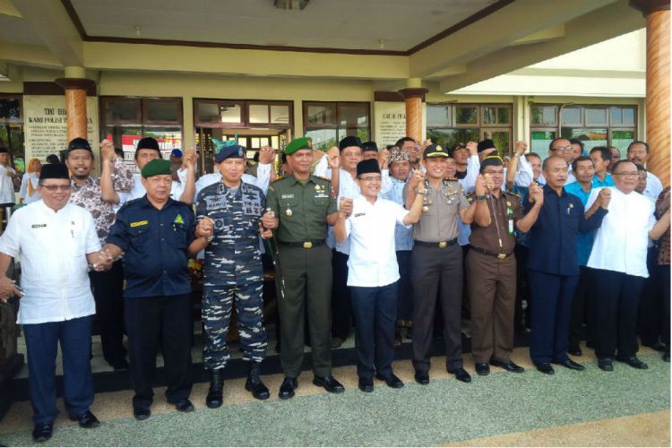 Merdeka.com, Banyuwangi - Disaksikan Bupati Banyuwangi, Jawa Timur Abdullah Azwar Anas, sejumlah elemen menggelar deklarasi di Mapolres Banyuwangi. Deklarasi ini bertujuan untuk menjaga stabilitas keamanan di Tanah Blambangan dari kelompok radikal yang bisa mengancam NKRI.