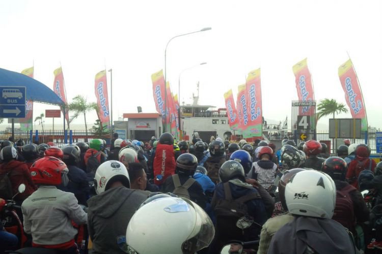 Merdeka.com, Banyuwangi - Setelah lebaran ketupat atau H+7 Idul Fitri 2018 lalu, penyeberangan Selat Bali kembali dipadati penumpang arus balik. Halaman Pelabuhan Ketapang Banyuwangi sampai dibanjiri penyeberang yang didominasi kendaraan roda 2, Minggu (24/6).