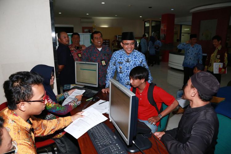 Bupati Anas dan Kepala Pajak Pratama banyuwangi (batik Ungu) saat di loket pelayanan pajak di Kantor Pajak Pratama. ©2017 Merdeka.com