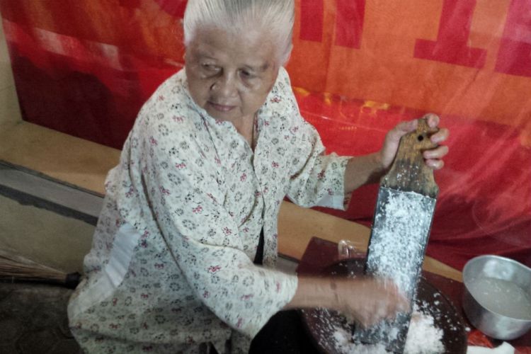 Mbah Juanik sendiri, bila senggang tidak ada pembeli, dia sempatkan untuk memarut kelapa. Semua jajanan tradisional yang dia jual, selalu diberi taburan kelapa ditambah gula pasir.