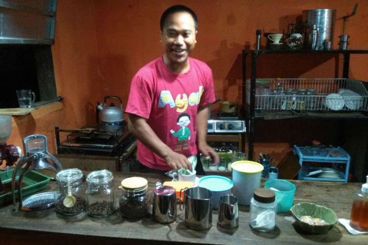 Salah satunya, bila Anda memesan kopi tubruk, mulanya Hadi akan merebus air. Sambil menunggu air mendidih, dia akan menggiling biji kopi dengan alat grinder, sesuai takaran tiap cangkir. Biiji kopi yang sudah halus menjadi bubuk lantas dia tuang ke dalam cangkir. Kemudian, gula pasir dia tuang di wadah lain, untuk memisahkannya.