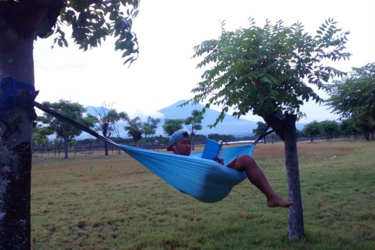 Laki-laki yang berprofesi sebagai guide itu sering menghabiskan waktu di tepi pantai Pulau Santen dengan membaca buku. Dengan memasang hammock atau tempat tidur gantung, ia pun mengaku nyaman sendiri saja menikmati sore hari yang teduh.