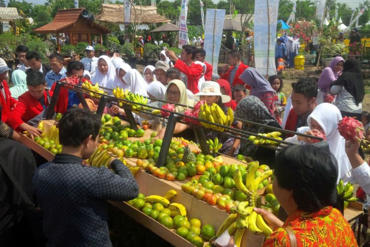 Merdeka.com, Banyuwangi - Banyuwangi Agro Expo 2018 diserbu pengunjung. Pameran pertanian Banyuwangi ini makin semarak saat warga yang datang pesta makan buah lokal secara gratis. Momen buah gratis ini disajikan di sela kunjungan Menteri Menteri Desa Pembangunan Daerah Tertinggal dan Transmigrasi (Mendes PDT), Eko Putro Sandjojo, didampingi Bupati Banyuwangi Abdullah Azwar Anas, Selasa (17/7).
