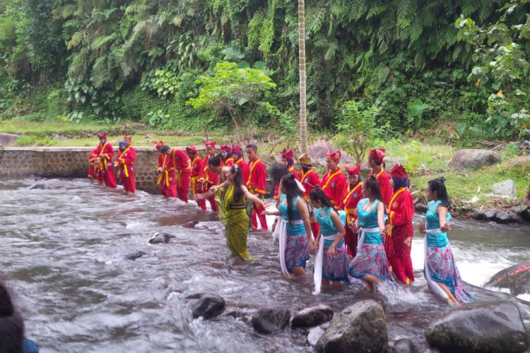 Setelah berada di dekat iringan musik seperti dawai, gendang, seruling dan karinding, kolaborasi musisi lokal dan mancanegara, para penari ini lantas turun ke aliran sungai sambil terus menari. Aroma dupa yang terselip di ikatan rambut penari membuat nilai sakralitas semakin kuat.